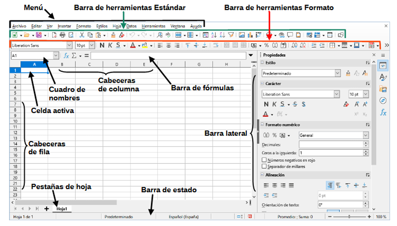 - Abre una hoja de cálculo nueva. Dibuja la ventana que aparece y señala sus partes principales.