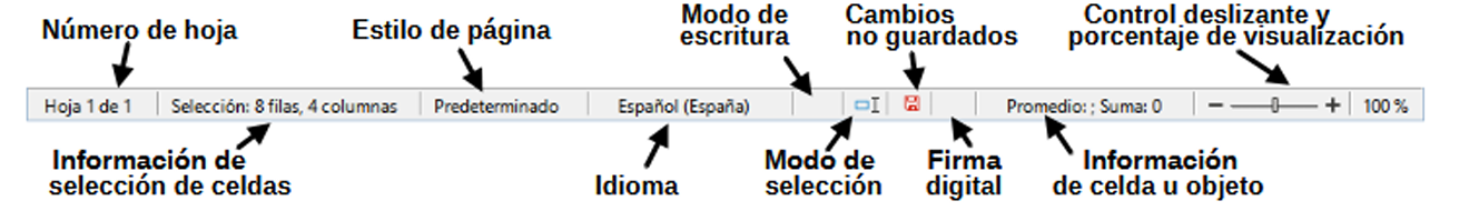 - La barra de estado muestra información sobre la hoja de cálculo y permite acceder rápidamente a algunas de sus características.