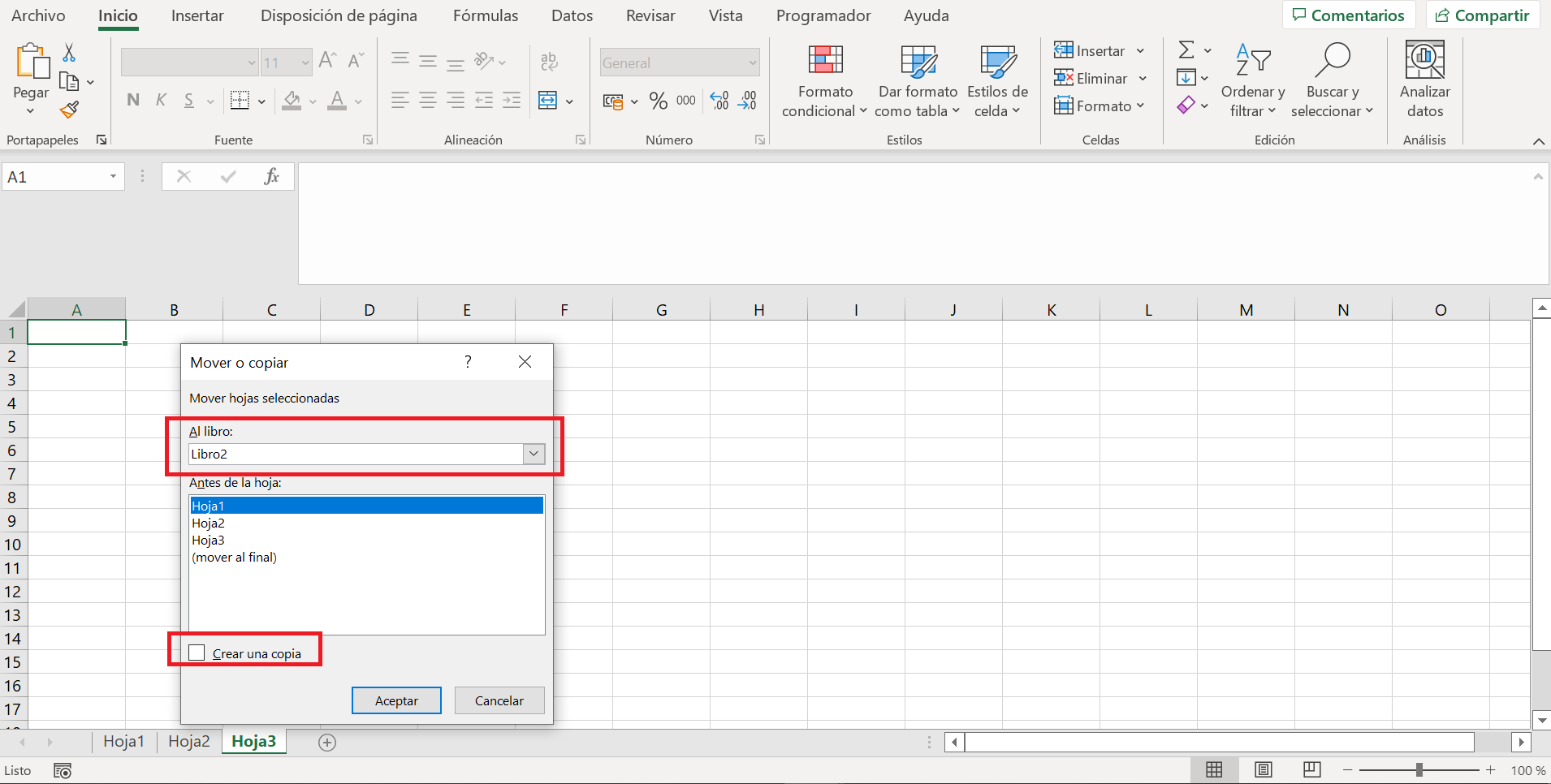 Y se abrirá una nueva ventana con diferentes opciones: Mover al final o crear una copia. Lo primero será seleccionar el libro donde se quiere mover o hacer la copia. Después se puede apretar a mover al final o seleccionar crear una copia dependiendo de lo que se quiera realizar.