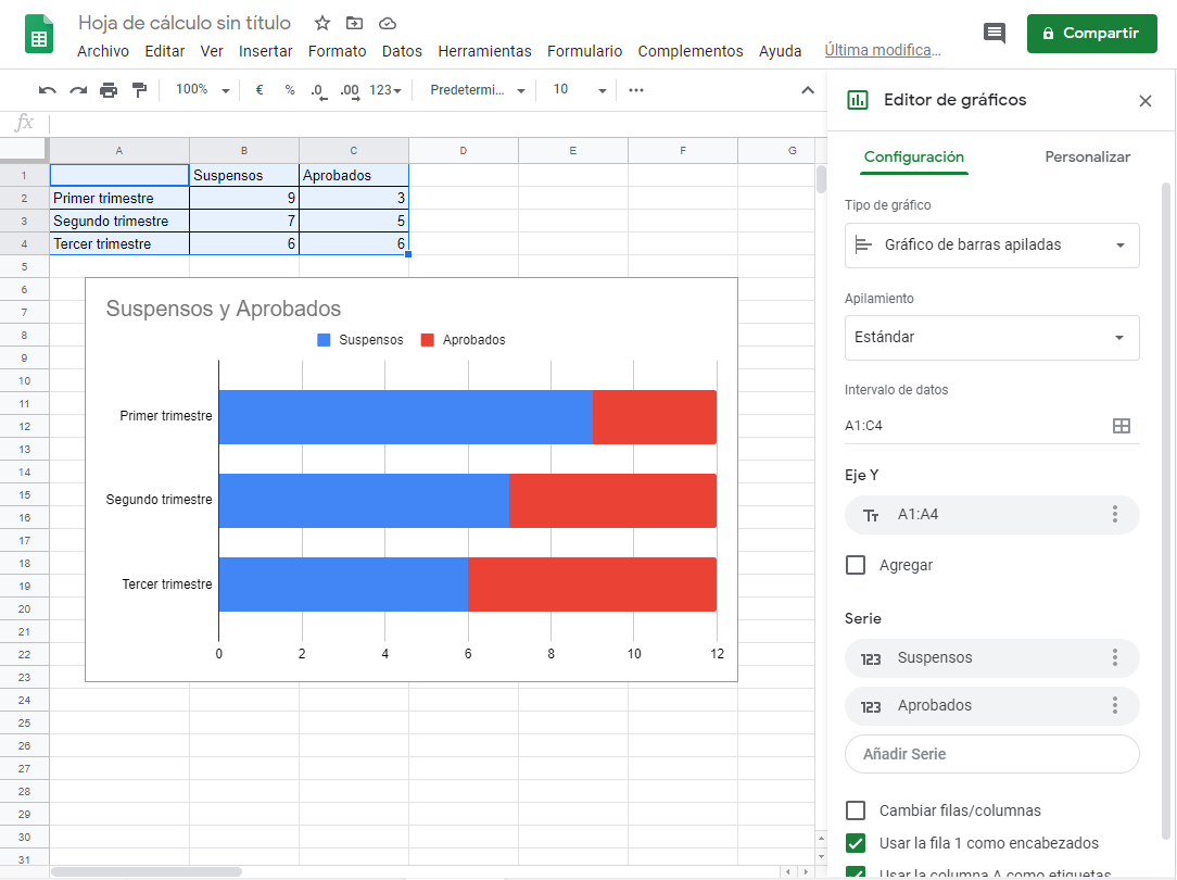 - Se creará un nuevo gráfico sugerido por el programa, con los datos de la tabla y se mostrará a la derecha la ventana del Editor de gráficos, mediante la que podremos cambiar varios aspectos del gráfico, como veremos más adelante.