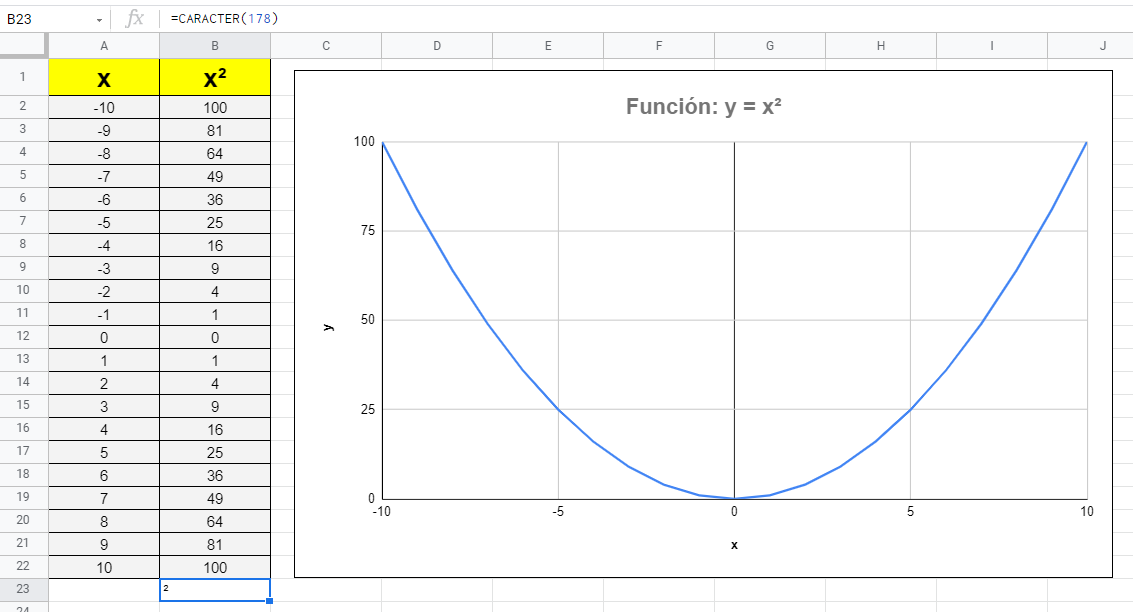 - Representa las funciones x^2 tal y como se muestra en la siguiente gráfica: (Puedes conseguir el carácter de cuadrado mediante la función