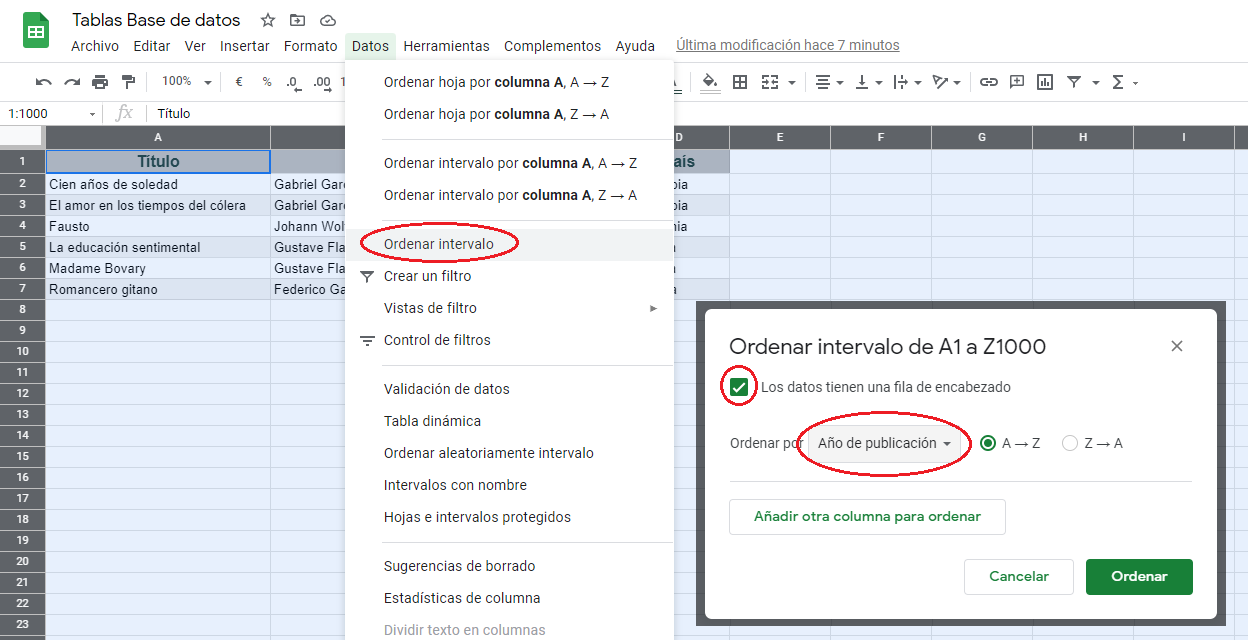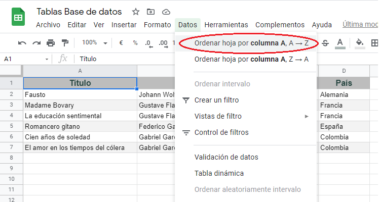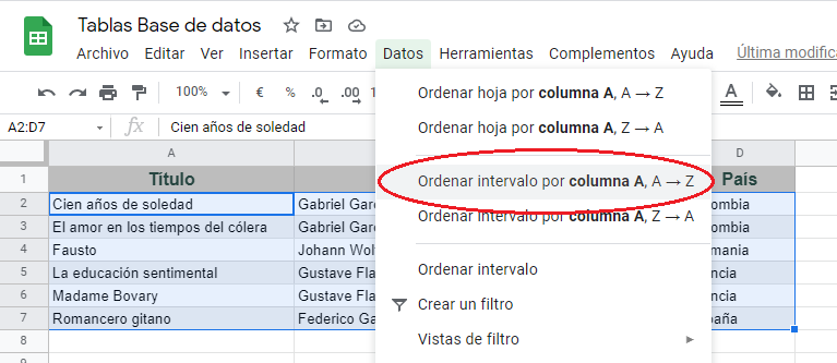 Si lo hacemos así, tenemos el problema de que el encabezado de cada columna entran dentro del orden de los datos y se quitan de la primera fila. Para evitar esto, tenemos que seleccionar todos los datos menos la fila del encabezado y seleccionar Datos -> Ordenar intervalo por columna A, A -> Z del menú.