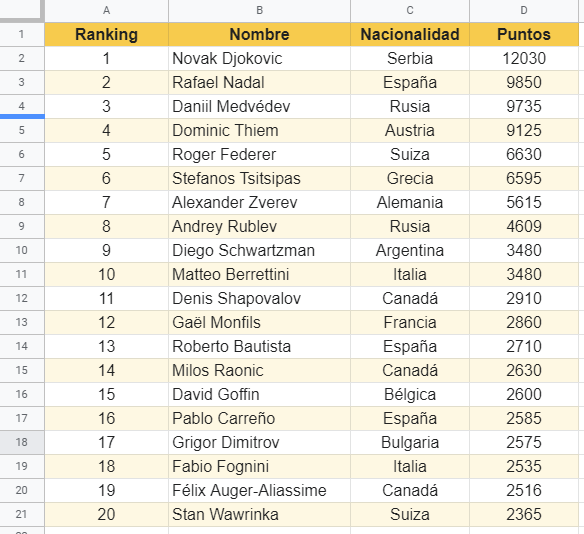 - Haz una copia de la siguiente hoja de cálculo de Calc con los datos del Ranking de la ATP de Febrero de 2021, pulsando sobre la misma.