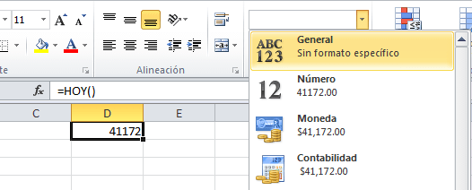 Para conocer el número de serie que nos ha devuelto la función HOY será suficiente con cambiar el formato de la celda a General: