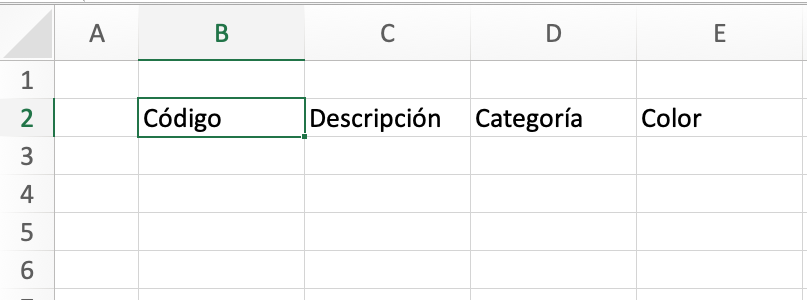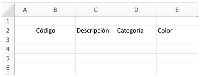 Lo primero que vamos a hacer es crear un hoja de cálculo con 4 columnas a la que le llamaremos Listas_Articulos: y crearemos una fila con los siguientes títulos, Código, Descripción, Color y Categoría.