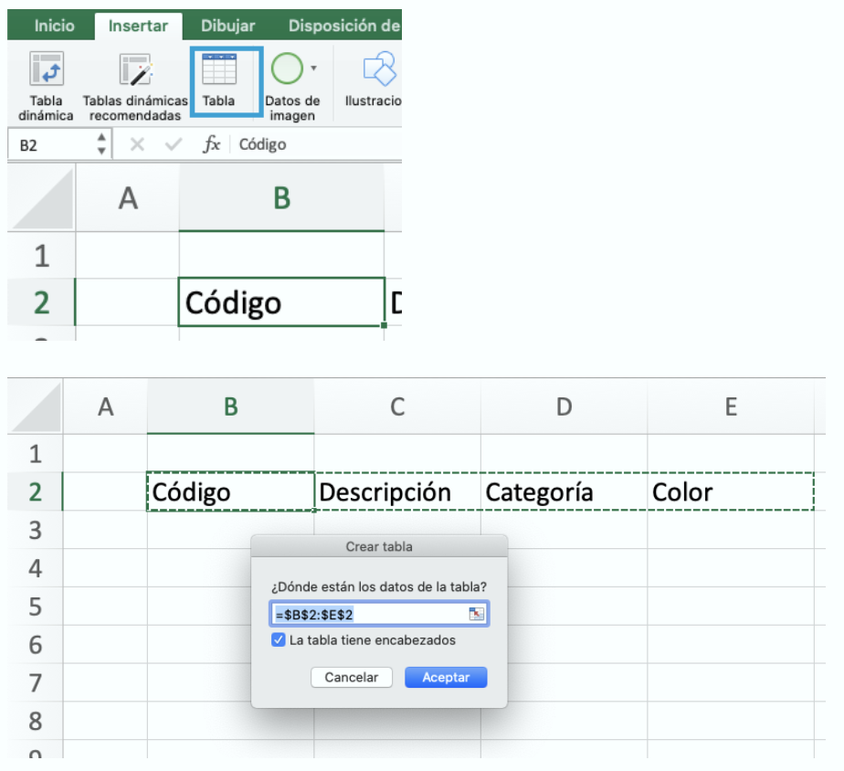 En el menú Insertar, hacemos clic en Tabla, y veremos una ventana, en esa vamos a marcar «La tabla tiene encabezados» le seleccionamose y hacemos clic en el botón Aceptar.