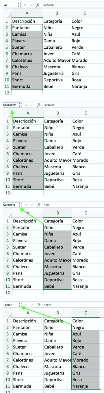 En este caso, esas son los rangos A2:A11, B2:B11 y C2:C11 entonces la seleccionamos uno por uno y le damos un nombre al rango: