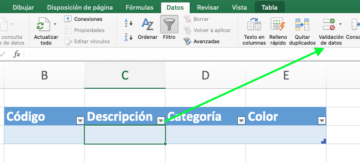 Ahora regresamos a la hoja anterior (Listas_Articulos) y seleccionamos la celda en donde debe ir la lista desplegable y el menú Datos, vamos a hacer clic sobre la opción Validación de Datos.