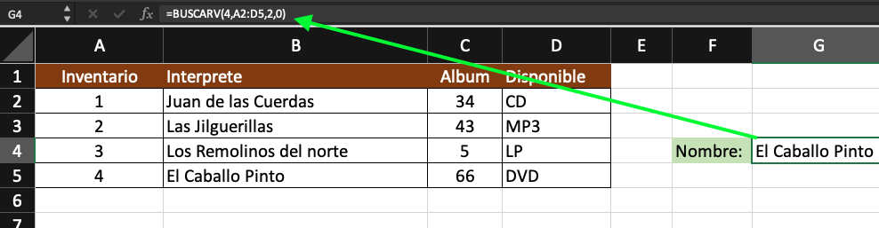 En la práctica, una función BUSCARV se vería de la siguiente manera: =BUSCARV(4,A2:D5,2,0)