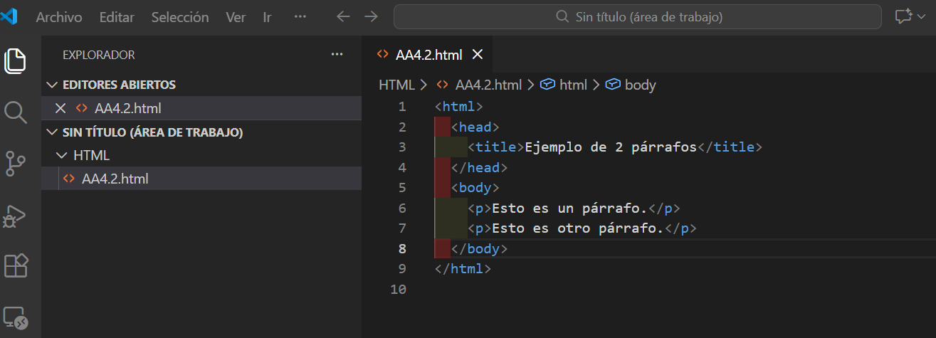 <html> <head> <title>Ejemplo de 2 párrafos</title> </head> <body> <p>Esto es un párrafo.</p> <p>Esto es otro párrafo.</p> </body> </html>