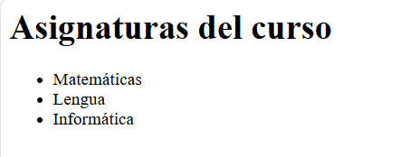 <html> <head> <title>Mi primera lista</title> </head> <body> <h1>Asignaturas del curso</h1> <ul> <li>Matemáticas</li> <li>Lengua</li> <li>Informática</li> </ul> </body> </html> - Busca en el ordenador la página creada y ábrela con el navegador.
