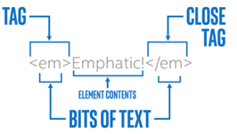 Una página web se basa en elementos representados por etiquetas, que organizan y presentan contenido, estableciendo la jerarquía y semántica de la información. Todas las etiquetas HTML disponen de los símbolos mayor que < y menor que >, y normalmente se utilizan en parejas. Una al principio (etiqueta de apertura) y otra al final del texto al que afectan etiqueta de cierre.