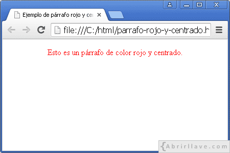 head, empleando para ello una etiquetastyleque englobe todas las reglas. Por ejemplo, para aplicar los dos estilos del ejemplo anterior (para párrafos yh1) a toda la página, pondríamos algo como esto en elhead:<!DOCTYPE html> <html lang="es-ES"> <head> <meta charset="utf-8" /> <title>Ejemplo de párrafo rojo y centrado</title> <style> p { color: red; text-align: center; } </style> </head> <body> <p>Esto es un párrafo de color rojo y centrado.</p> </body> </html>
