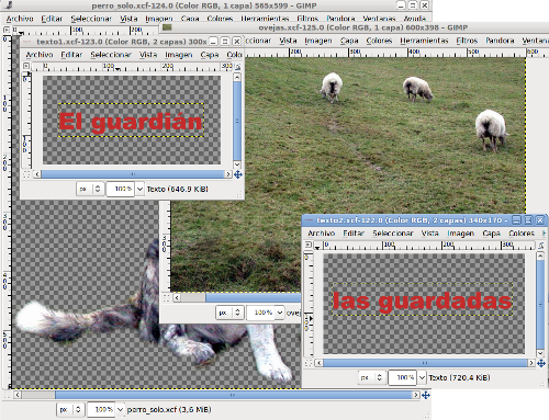 Las cuatro imágenes se muestran cada una en su Ventana imagen. Primero vas a trabajar con la imagen "ovejas.xcf", que la usarás de fondo para ir colocando en ella el resto de las imágenes.