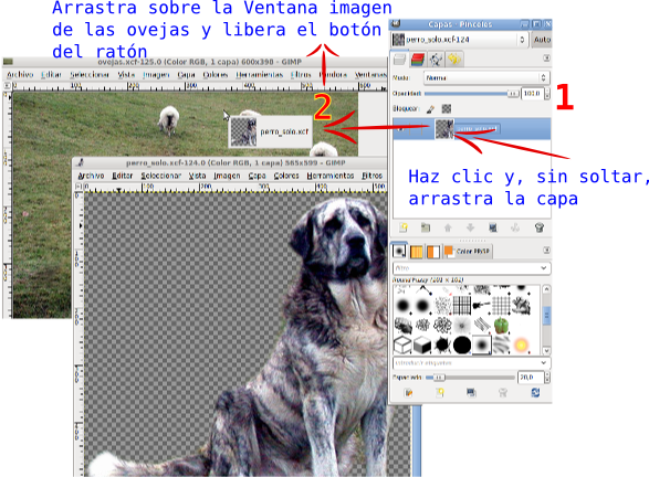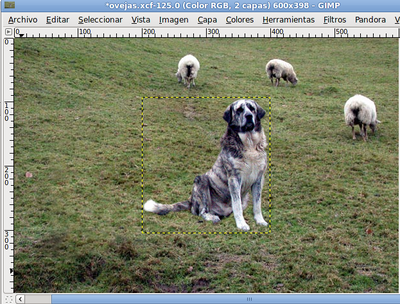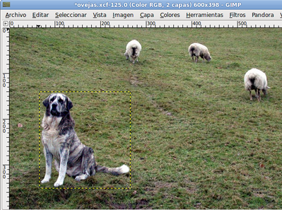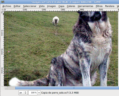 Comienza por colocar la capa que contiene la imagen del perro dentro de la Ventana Imagen del archivo "ovejas.xcf", arrastrándola desde la Ventana Capas.
