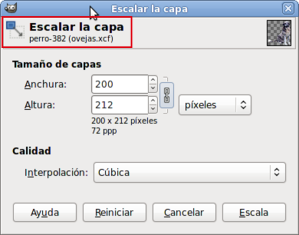 - Renombra la capa "Copia de perro_solo" que se acaba de crear como "Perro". Con ella seleccionada, haz clic con el botón derecho del ratón sobre la paleta de Capas y elige Escalar capa, escribe 200 píxeles como valor de anchura y pulsa Aceptar. Comprueba que el perro ya cabe en la imagen.