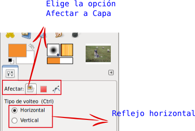 - Ahora vas a reflejar el perro, es decir, vas a poner el perro mirando hacia la izquierda para compensar un poco la imagen. Selecciona la herramienta de volteo en la Caja de herramientas y pon el puntero del ratón encima de la imagen del perro, después de haber comprobado en las Opciones de herramienta que tienes seleccionada la opción Horizontal, también hay que pulsar el primer botón situado al lado de la palabra Afectar para que actuemos sobre la capa "perro".