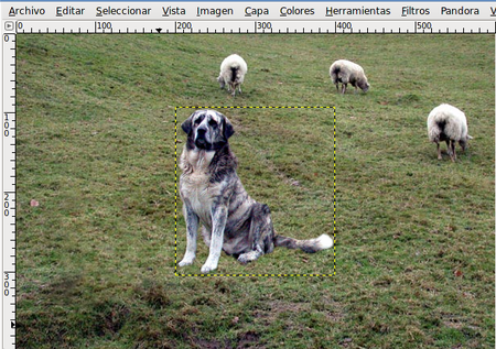 Una vez abierta la imagen del perro en la Ventana Imagen que contiene la imagen de las ovejas puedes observar que la capa del perro es muy grande en relación a la imagen de las ovejas.