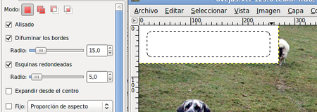 Elige la herramienta Selección rectangular , en las Opciones de esta herramienta selecciona Difuminar los bordes con un radio de 15 y, también, marca la opción Esquinas redondeadas con un valor de 5. En la Ventana imagen haz una selección rectangular sobre la nueva capa creada, dejando un pequeño margen exterior, tal y como ves en la imagen. Más adelante nos permitirá crear un difuminado de la selección realizada.