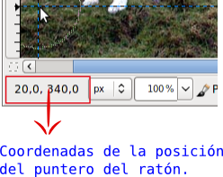 - Coloca dos Guías horizontales en las posiciones 135 y 340; y otras dos verticales en los píxeles 20 y 580. Puedes orientarte por las coordenadas que va mostrando la barra de estado de la Ventana imagen. Si encuentras muchas dificultades para colocar las guías de esta forma, recuerda que puedes colocar guías accediendo al menú Imagen --> Guías --> Guía nueva.