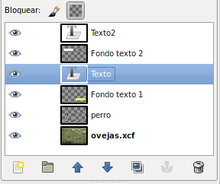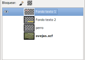 - Ahora coloca el texto. Recuerda que tienes dos imágenes, "texto1.xcf" y "texto2.xcf", abiertas en GIMP. Desde la Barra de tareas puedes acceder a ellas. Haz clic en la Ventana imagen del archivo "texto1.xcf" y desde la Ventana capas arrastra la capa "Texto" a la Ventana imagen del archivo "ovejas.xcf". Libera el ratón y tienes una nueva capa que se autodenomina "Texto", cambia el nombre a "Texto1". Luego haz lo mismo con la otra imagen "texto2.xcf", arrastra la capa "Texto" y en la imagen compuesta llámala "Texto2".