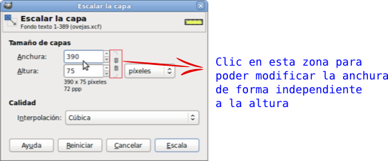 - Coloca ahora cada uno de los textos encima de las capas correspondientes. Como el texto ocupa un mayor espacio que el fondo, tienes que aumentar el tamaño de las capas "Fondo texto 1" y "Fondo texto 2". Selecciona la primera de ellas, haz clic con el botón derecho sobre ella y elige Escalar capa. Cambia su ancho por 300 píxeles. Haz lo mismo con la otra capa, en este caso pon 390 de ancho, pero desmarcando la Relación 1:1 para que se mantengan los 75 píxeles originales de altura. Si las capas quedan fuera de las guías vuelve a colocarlas en ellas.