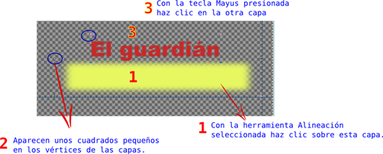 - Debes alinear las capas del fondo con cada una de las capas de texto. Deja sólo visibles las capas "Texto2" y "Fondo texto 2". En la Caja de herramientas elige la herramienta Alineación.