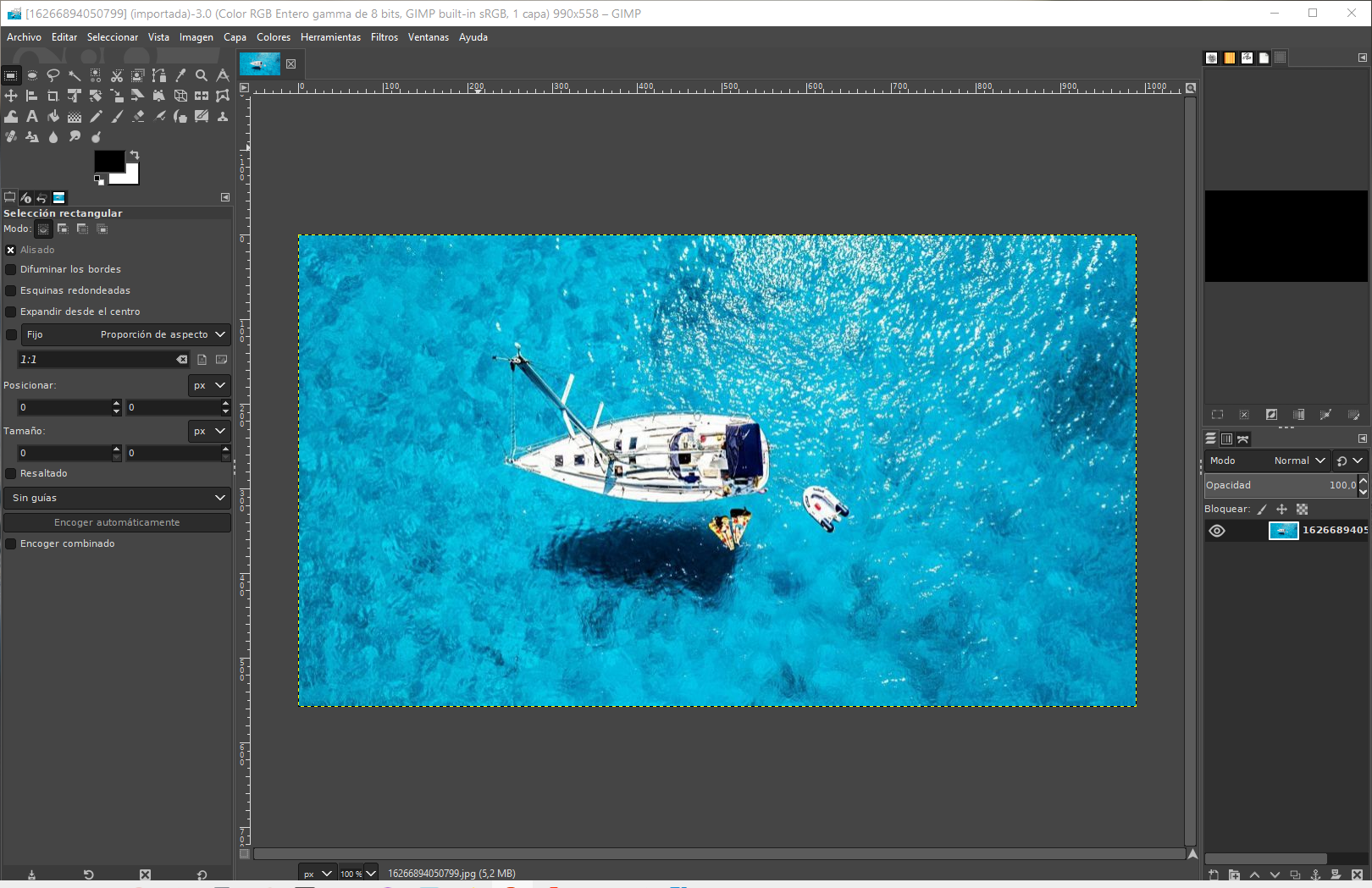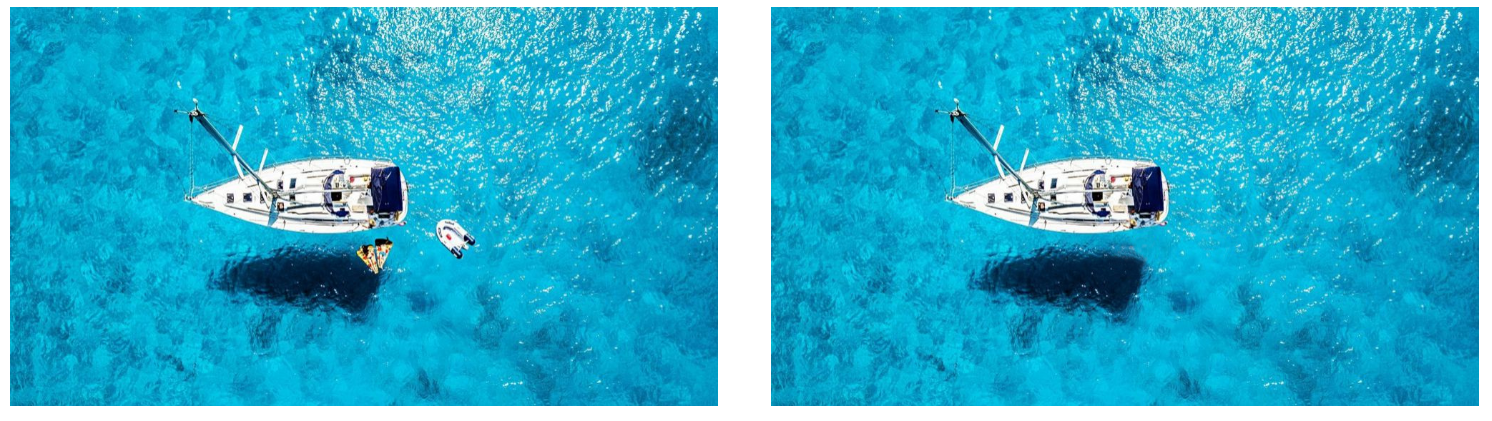 Abrir imagen En nuestro caso queremos eliminar todo lo que no es el barco, es decir, quitar de la foto tanto la embarcación hinchable como las dos colchonetas.