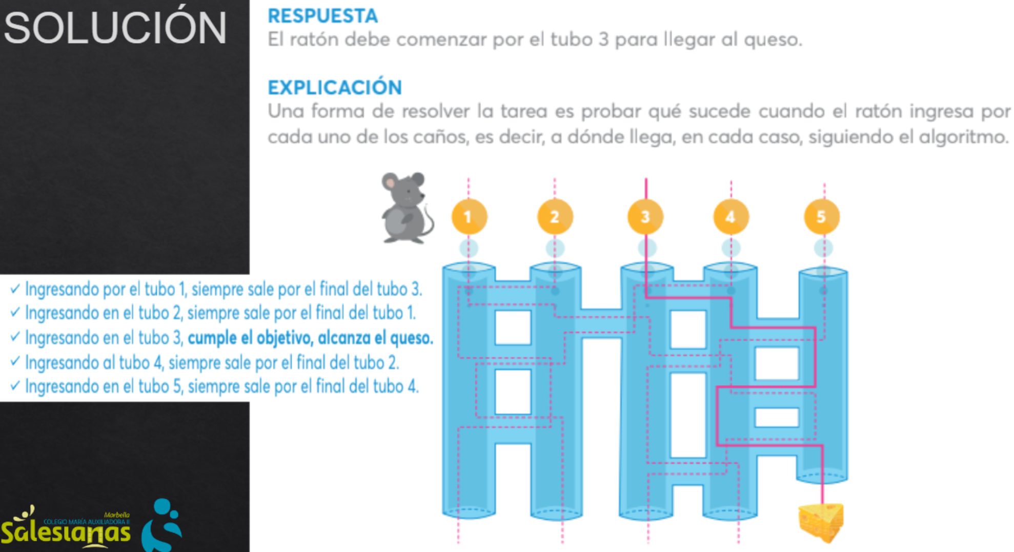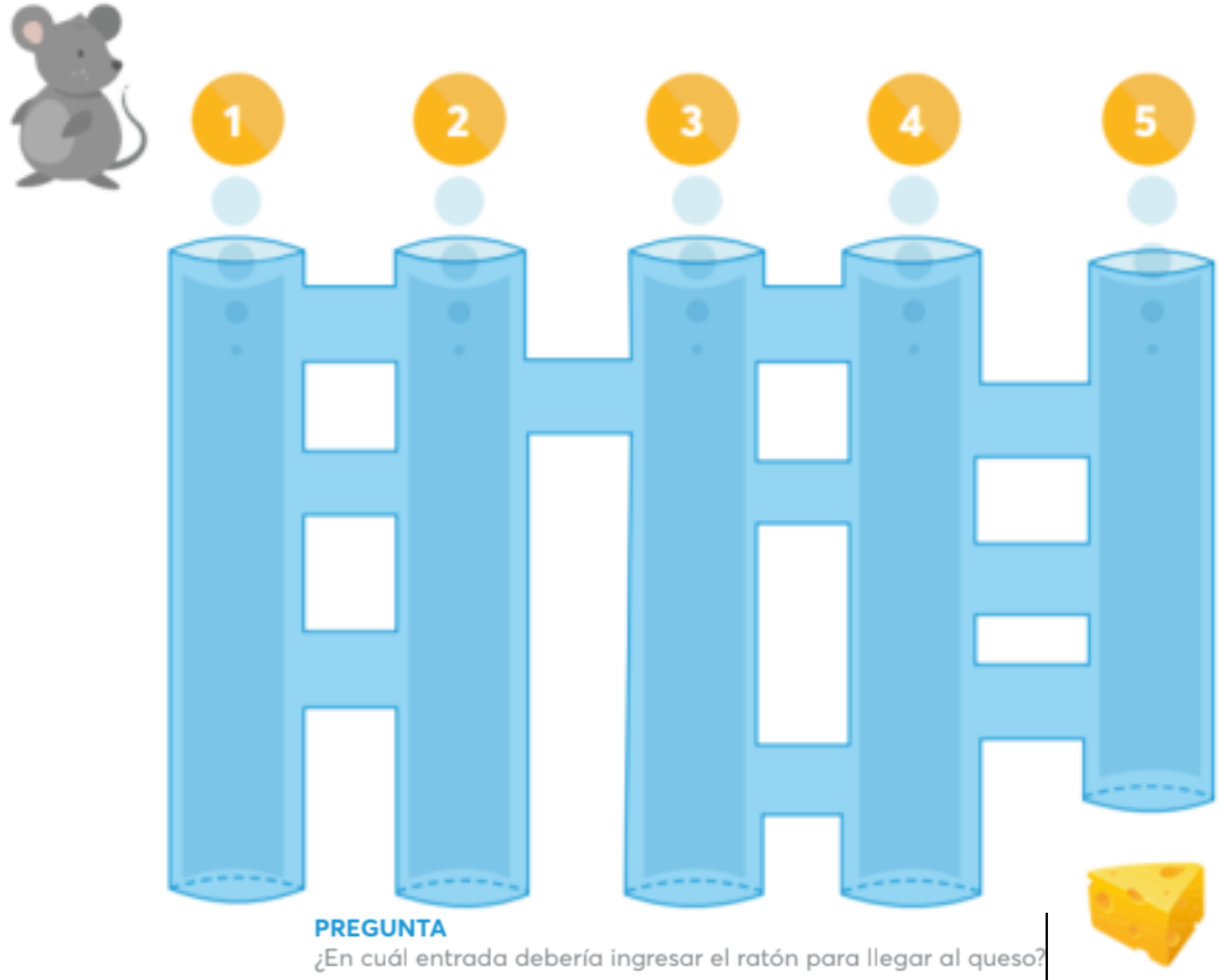Carla posee un ratón, llamado XC4, que ha sido entrenado para seguir un comportamiento basado en reglas. Asistes a un experimento donde el ratón está situado a la entrada de un sistema de cañerías y el objetivo es que llegue al queso que se encuentra al final de la quinta cañería.