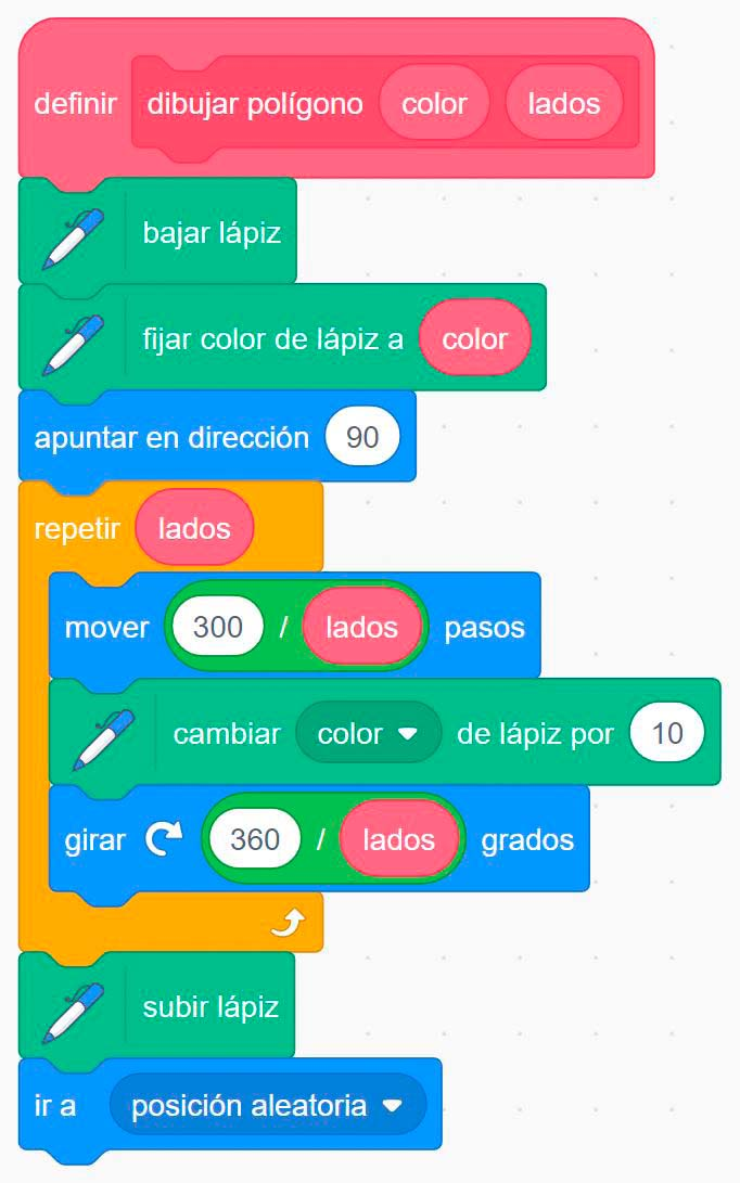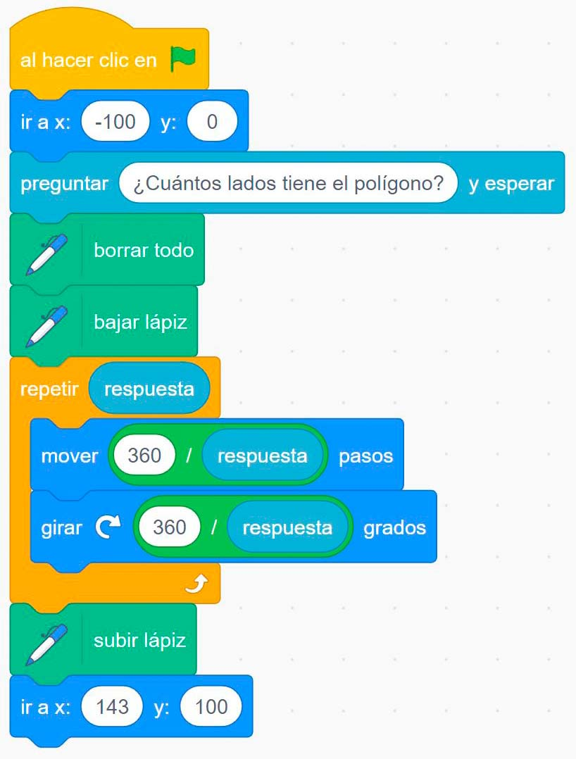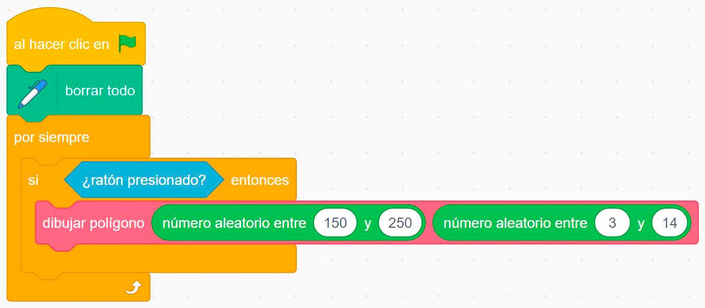 - En tu área de código has de tener un programa que comienza con la instrucción al hacer clic en bandera verde y un subalgoritmo o procedimiento de ese programa que comienza con la instrucción definir dibujar polígonos.