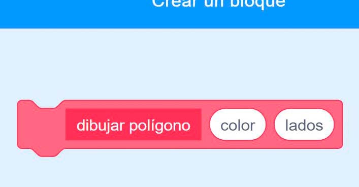 - Accede al menú Mis bloques y crea un bloque llamado dibujar polígono. Añade en él dos parámetros de tipo número llamados color y lados (figura 54).