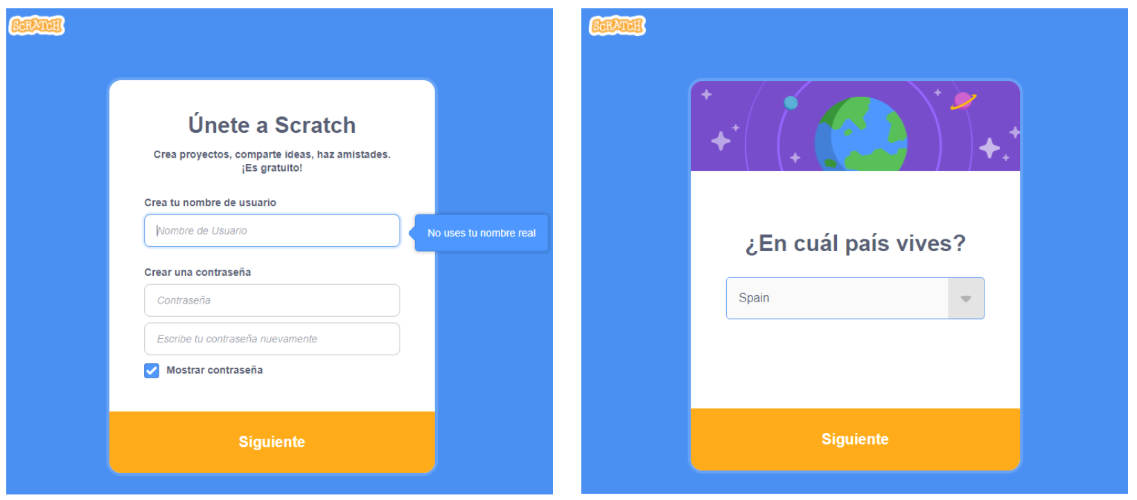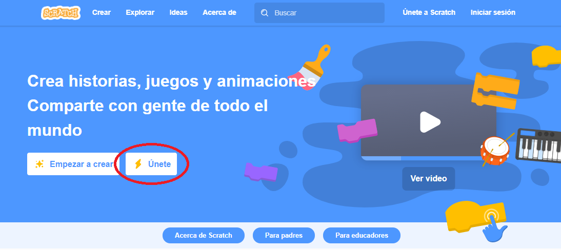 Al entrar por primera vez en la web de Scratch tenemos dos opciones: Empezar a crear, que nos permite entrar en Scratch sin registrarnos y Únete.