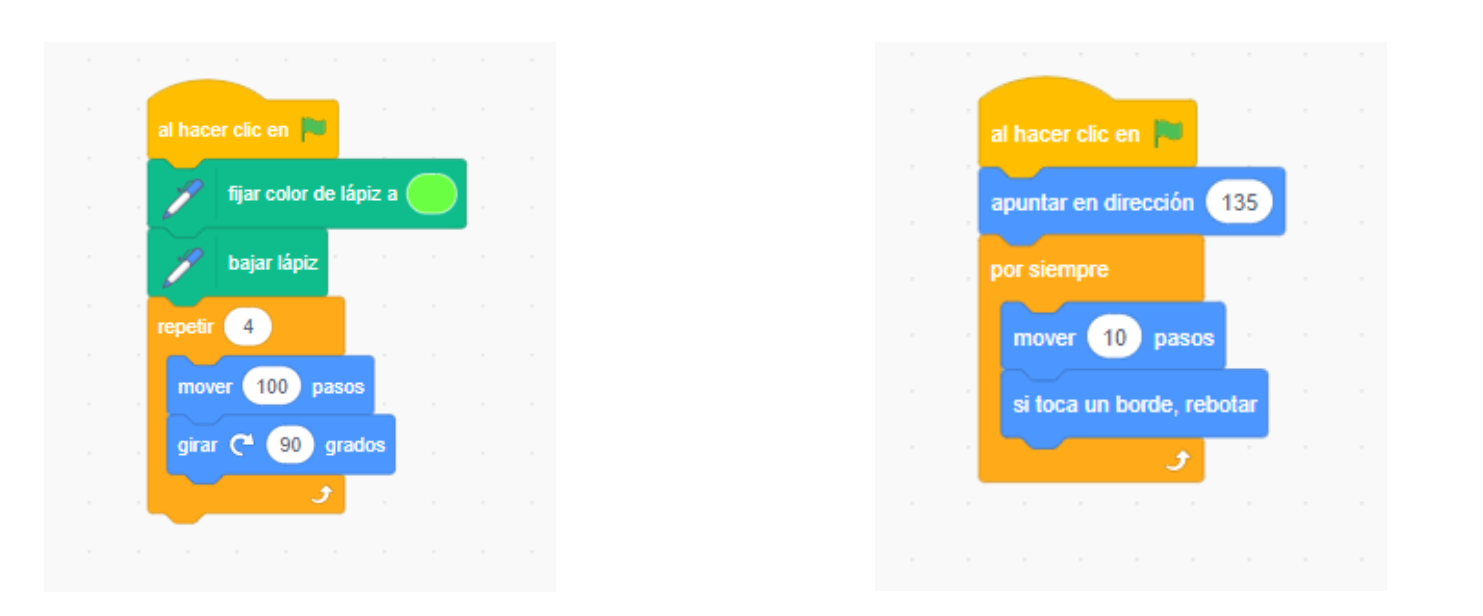 En los siguientes ejemplos se ha empleado el bloque de repetición "repetir (4)" para dibujar un cuadrado sin definir lado por lado y en el segundo ejemplo, se ha utilizado el bloque de repetición "por siempre" para no tener que estar moviendo continuamente al personaje. (Si no has quitado el lápiz, se hace un dibujo muy chulo).