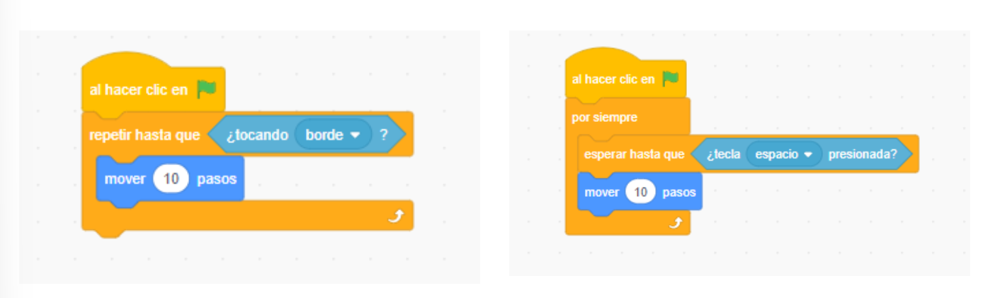 Otras estructuras repetitivas son: "repetir hasta que (...)", que repite hasta que pasa "algo", como pulsar una tecla, chocar contra el borde, etc. y el bloque "esperar hasta que (,...)", que espera hasta que pasa "algo". Programas muy utilizados en juegos con movimiento.