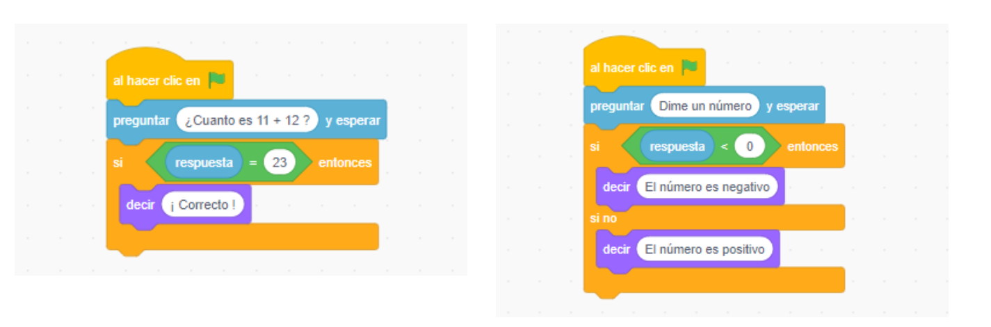 Las condiciones básicas son "Si..." y "Si... , sino..." y están dentro de la categoría Control (color naranja) Veamos unos ejemplos para aclarar su uso: