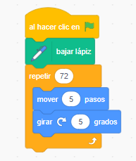 - Crea un programa en el que el personaje avance 90 pasos dibujando una línea en color rojo, de grosor 5, a continuación debe girar 72 grados y repetir los pasos anteriores durante 5 veces (Sin utilizar estructuras de repetición). ¿Qué figura se ha obtenido?