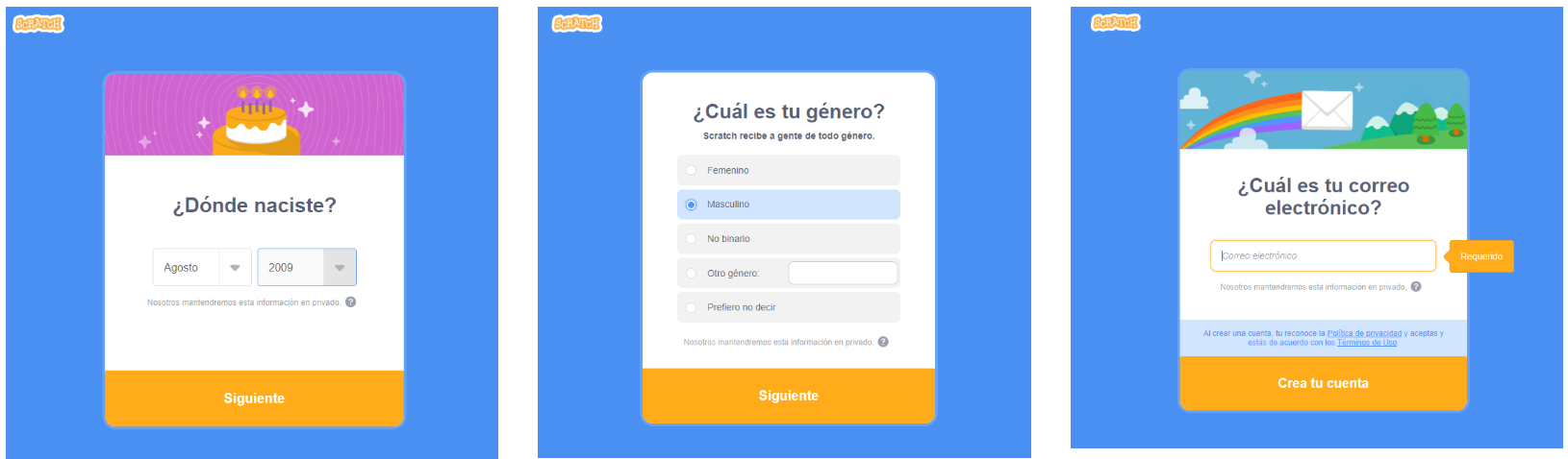 Escribimos nuestra fecha de nacimiento, género y correo electrónico del instituto en sucesivas pantallas.