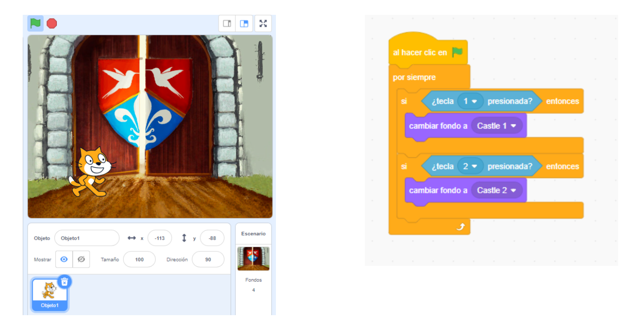 Simula un personaje que pasa de una zona a otra de un juego, por ejemplo elige dos fondos de la categoría "ciudad" y haz que el personaje se mueva hacia la derecha. Cuando toque el borde, cambia el fondo y haz que el personaje aparezca a la izquierda.