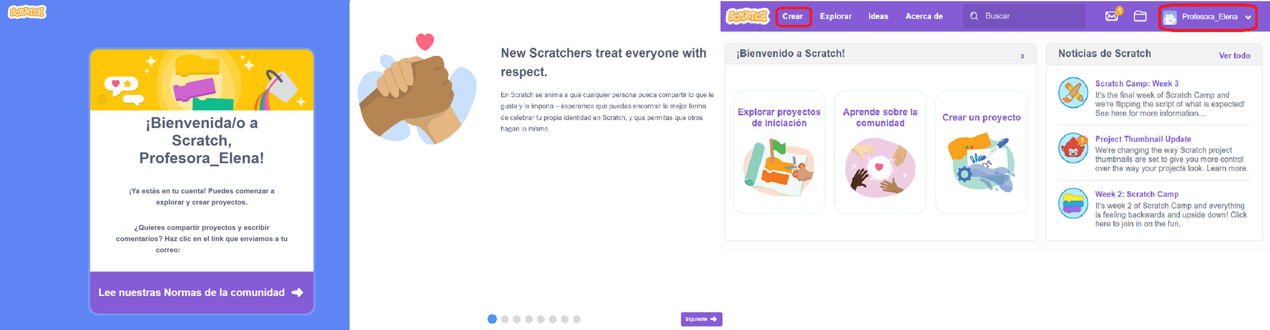Un mensaje de bienvenida nos dice que nos hemos registrado correctamente. Pulsando en el botón Lee nuestas Normas de la comunidad, accedemos a una serie de normas y finalmente a nuestro Scratch.