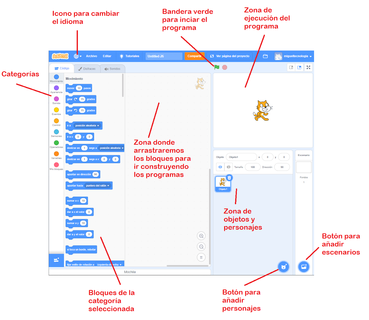 Scratch desarrolla historias en un escenario en el que se pueden incluir distintos personajes y objetos que pueden ser programados de forma individual.