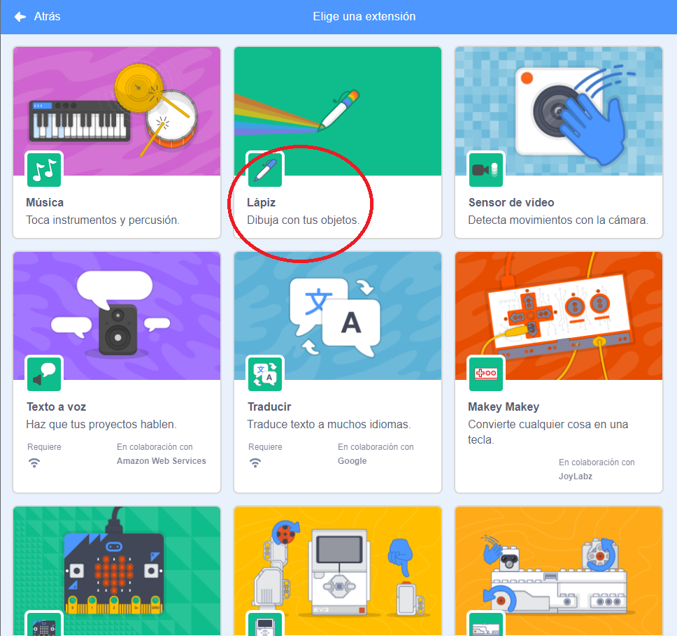 Podemos hacer que el personaje dibuje una línea mientras se desplaza, para ello hay que pulsar el icono de añadir extensión que se encuentra en la esquina inferior izquierda de la pantalla y elegir la extensión "Lápiz".
