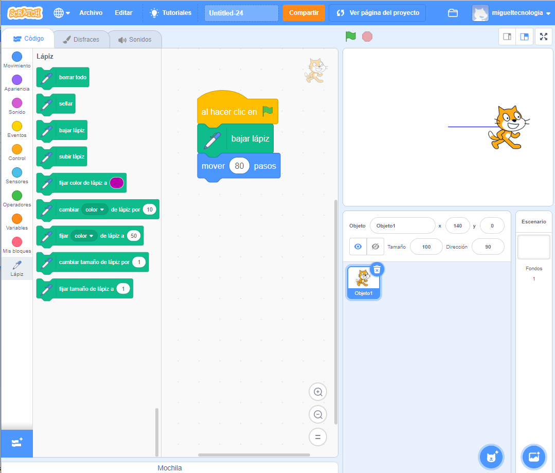 Si ponemos el bloque "bajar lápiz" antes de mover, veremos que Scratch va dibujando una línea mientras se mueve.