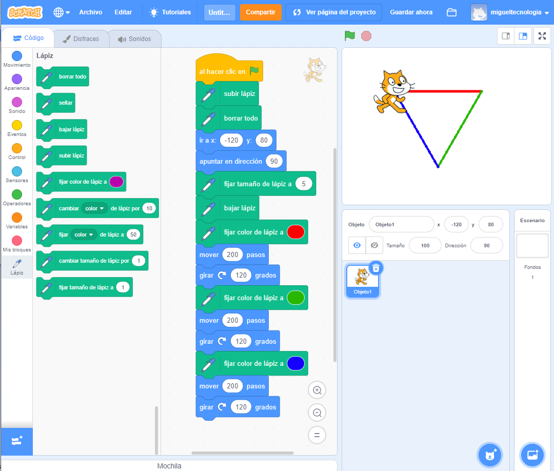 Dentro de la categoría Lápiz existen una serie de órdenes que permiten ajustar el grosor ("fijar el tamaño de lápiz a 1") y el color del lápiz ("fijar color de lápiz a ") para dibujos con distintas líneas. En el siguiente ejemplo hemos dibujado un triángulo equilátero con lados de grosor 5 y de tres colores distintos.