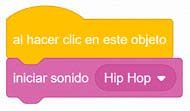 - Anida en esta instrucción la orden iniciar sonido..., de la categoría Sonido, y selecciona Hip Hop (este sonido se incluye en la biblioteca de sonidos de Scratch). Para encontrar este sonido, o cualquier otro de la biblioteca, te puede ser útil acceder a la pestaña Sonidos y escribir su nombre en el buscador.