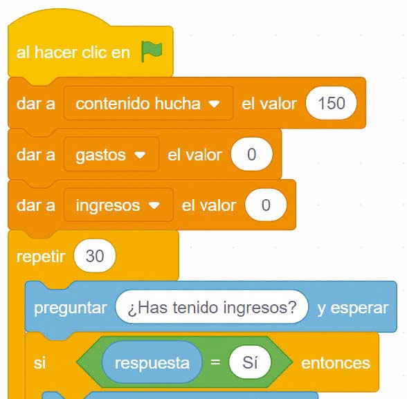 - Anida a continuación la instrucción sumar a ingresos respuesta, de la categoría Variables. De esta manera, el valor de la variable ingresos aumentará en el valor que se introduzca como ingreso cada vez.