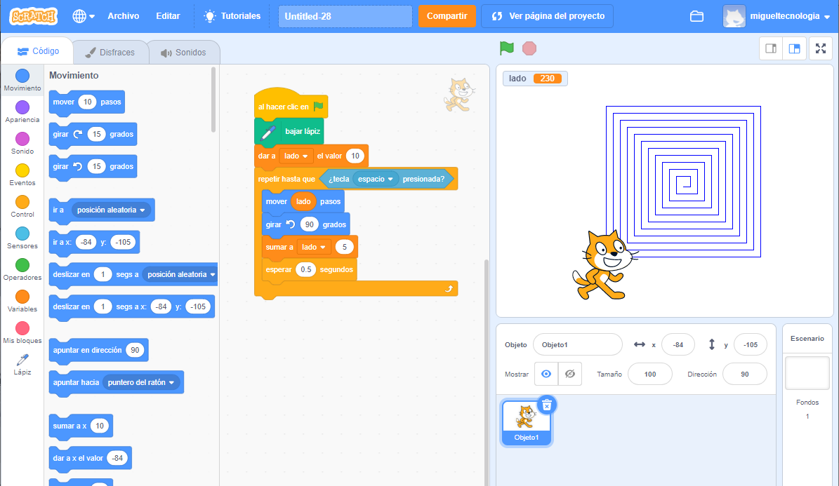 Los datos pueden ir cambiando durante la ejecución del programa, como en el siguiente ejemplo, en el que hemos creado una variable llamada lado cuyo valor inicial es 10, pero que se incrementa en 5 con cada paso del bucle, para ir incrementando el lado de la espiral cuadrada.