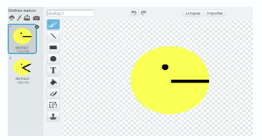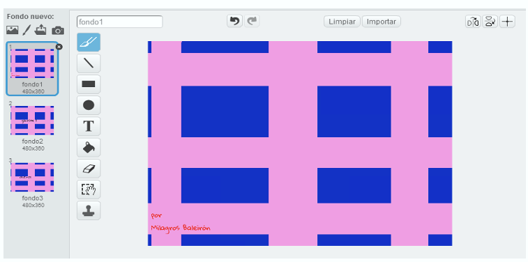 Lo primero que vamos a hacer es construir el laberinto en nuestro Escenario. Para ello pintamos el fondo de un color (en este caso rosado) y luego lo que hacemos es colocar rectángulos azules que harán las paredes del laberinto. La forma y ubicación la eligen ustedes. Ahora vamos a crear un nuevo objeto que será el Pacman. En este caso la alumna trabajó con dos disfraces para el personaje del Pacman, uno con la boca abierta y otro con la boca cerrada.