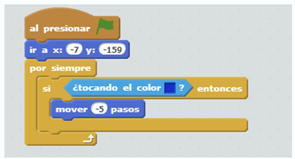 Además vamos a incluir otro código para que siempre comience en el mismo lugar de la pantalla y para que cuando se choque contra un bloque azul tenga que rebotar e ir para el otro lado.
