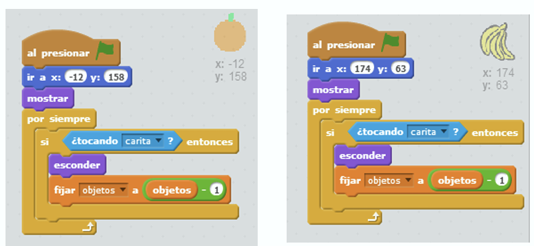 Como verán su código es similar, lo que cambia es la posición en la que se encuentran. Vamos a crear una variable objetos que lo que hace es contar la cantidad de objetos que hay en pantalla. Al inicio 2 . Cuando PacMan toca la fruta, la misma se esconde y la cantidad de objetos baja en 1.