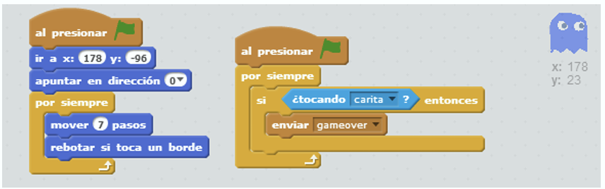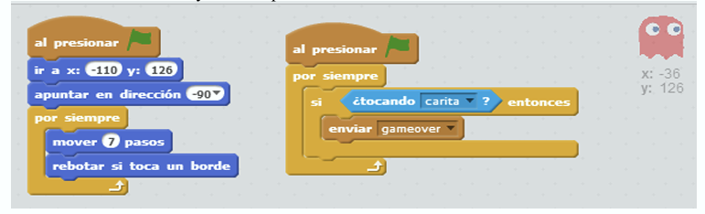 El segundo código hace que si toca al PacMan entonces mande una señal de GameOver. El fantasma azul tiene la variante de que apunta hacia arriba cuando inicia.